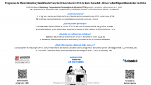 El Centro de Competencias Tecnológico de Alicante (CCTA) de Banco Sabadell y la Universidad Miguel Hernández han lanzado un programa de mentorización. En él, profesionales del CCTA guiarán y ayudarán a estudiantes de la UMH para que adquieran diferentes roles, competencias y habilidades clave en su futura actividad laboral y profesional. Además, para potenciar y dar a conocer estas habilidades se trabajará en un reto/proyecto con la ayuda y guía de un mentor o mentora. Lo importante será el proceso de aprendizaje y no el resultado del reto en sí. De forma adicional a las sesiones de mentoring: