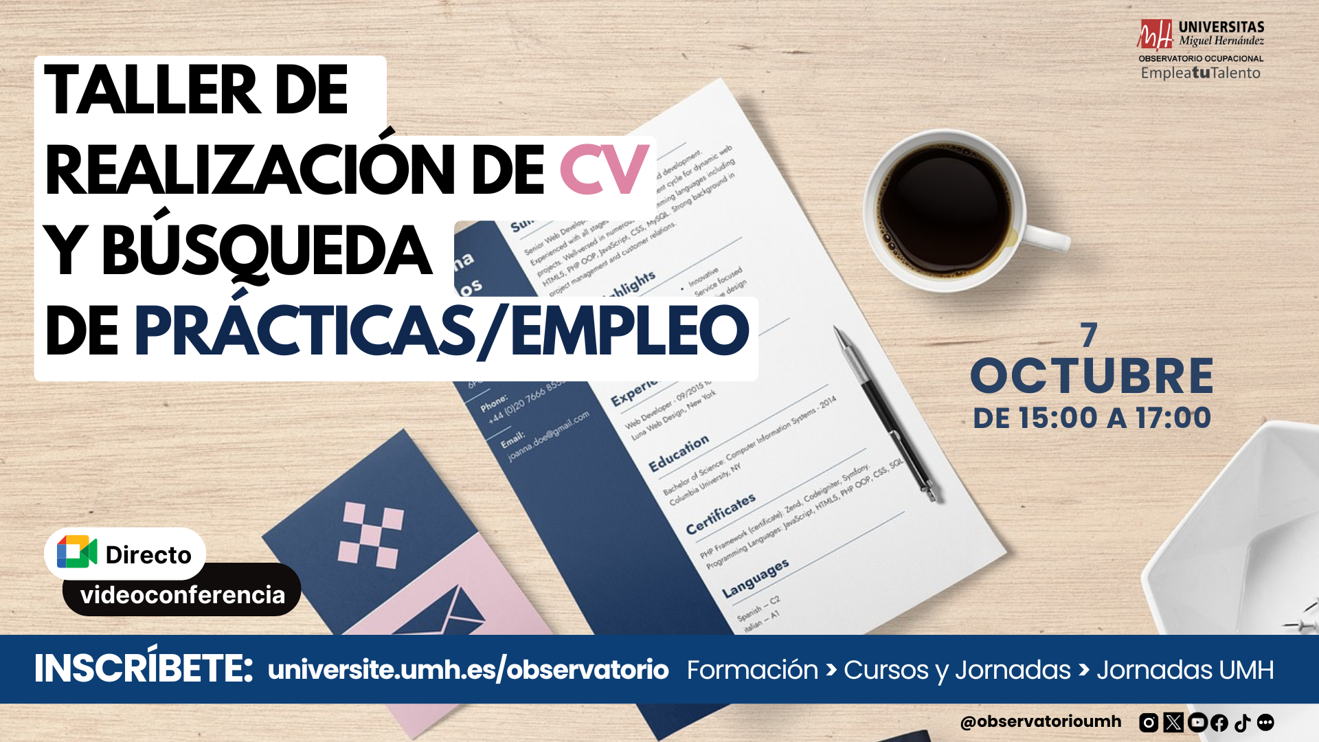 Desde el Observatorio Ocupacional te informamos de una nueva edición del «Taller online de realización de CV y prácticas/empleo», dirigido a estudiantes y titulad@s UMH, y que impartirá nuestra compañera Ana Martínez. Tendrá lugar el martes 7 de octubre, de 15:00 a 17:00 horas, de forma online a través de Google Meet. En esta actividad podrás: