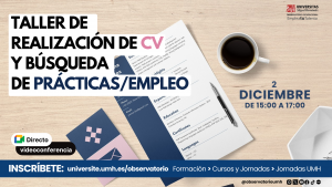Desde el Observatorio Ocupacional te informamos de una nueva edición del «Taller online de realización de CV y prácticas/empleo», dirigido a estudiantes y titulad@s UMH, y que impartirá nuestra compañera Ana Martínez. Tendrá lugar el martes 2 de diciembre, de 15:00 a 17:00 horas, de forma online (Google Meet). En esta actividad podrás: